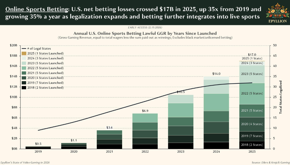 Онлайн-гемблинг становится одним из ключевых конкурентов видеоигр в борьбе за время и деньги американцев, следует из отчета The State of Video Gaming in 2026. Документ был подготовлен генеральным директором инвестиционной компании Epyllion Мэттью Боллом.